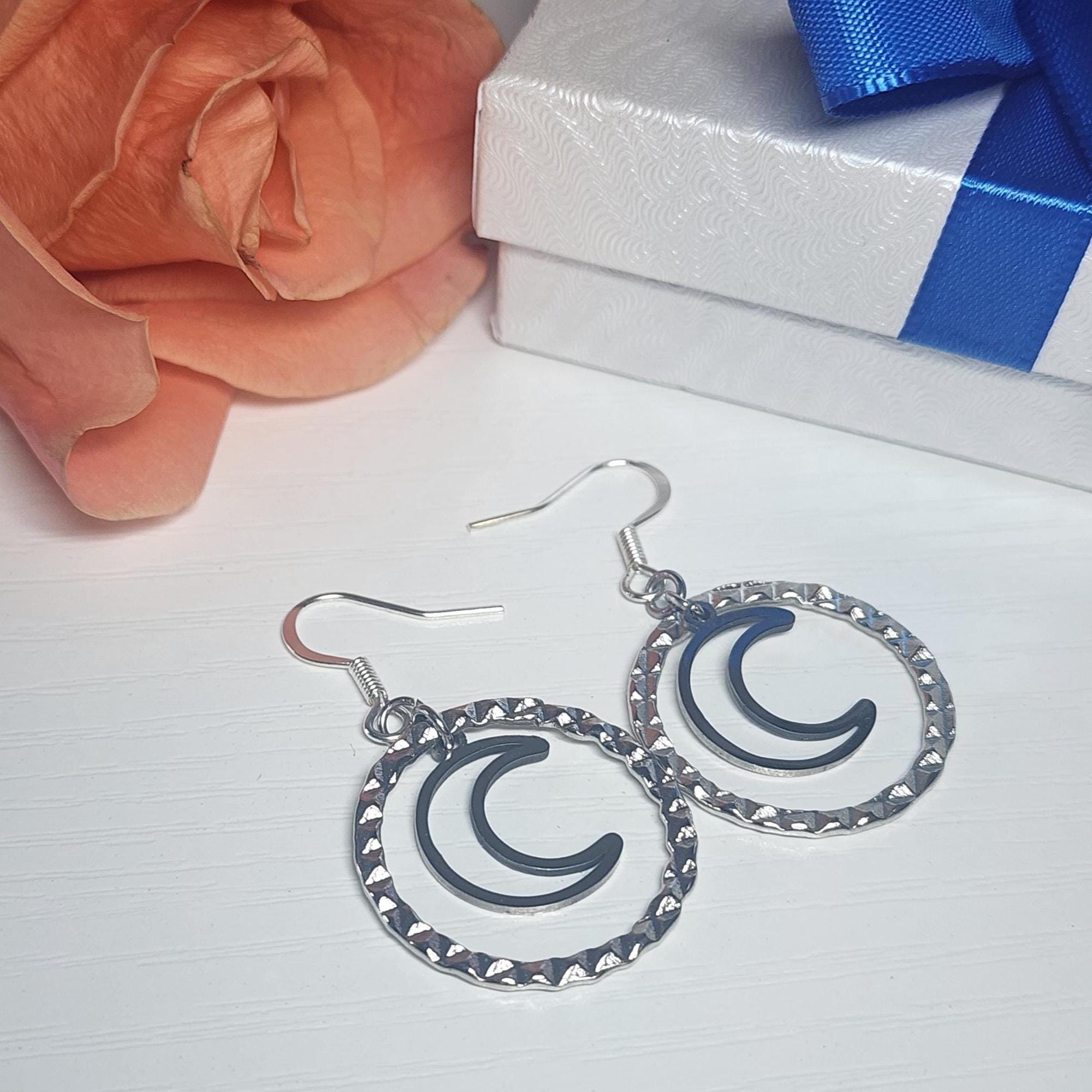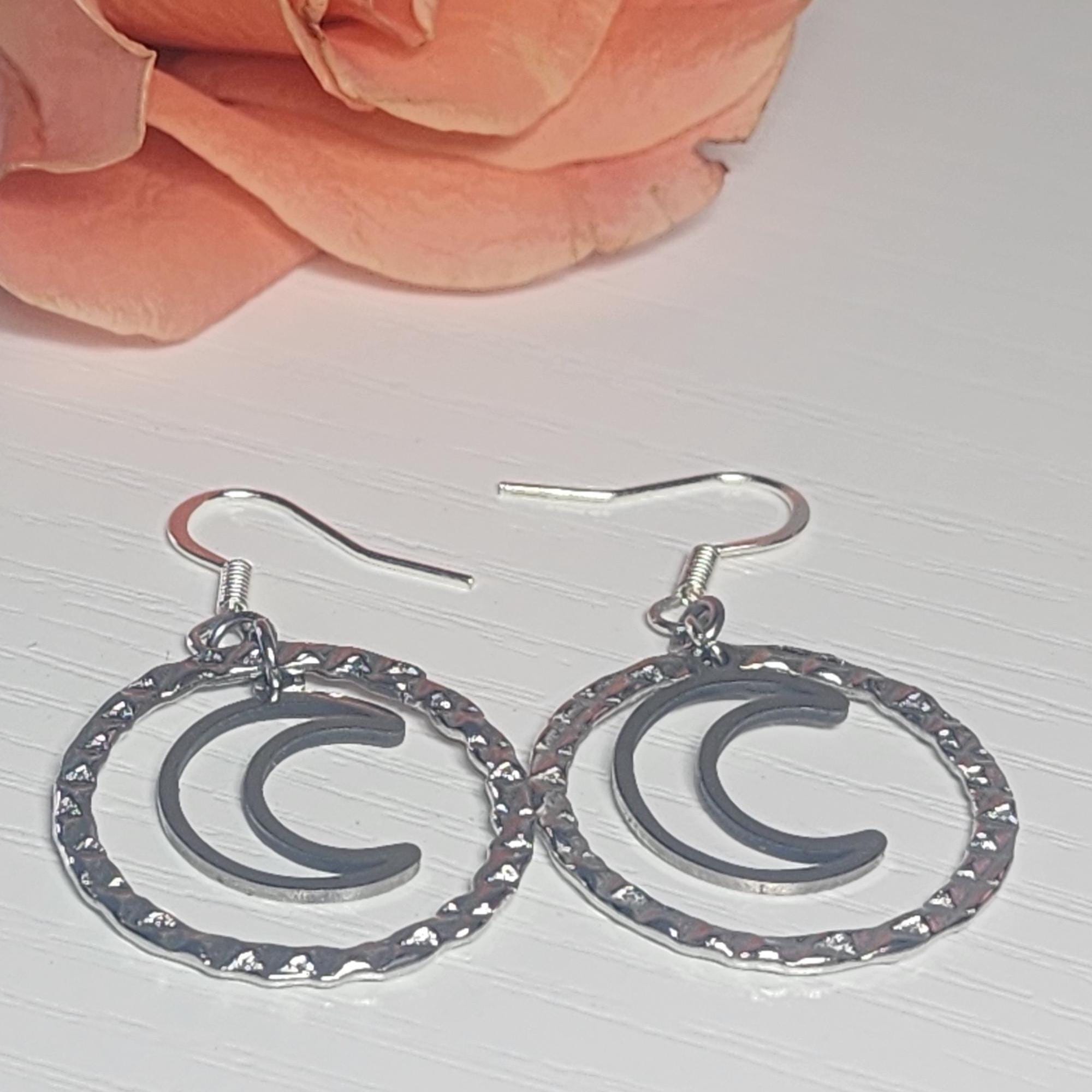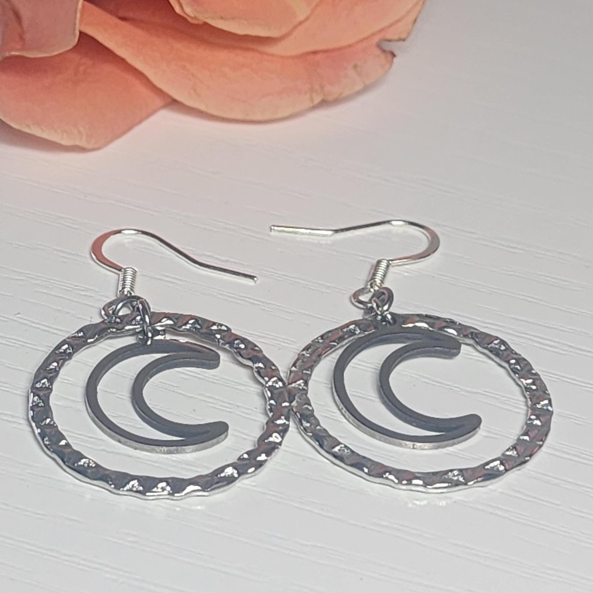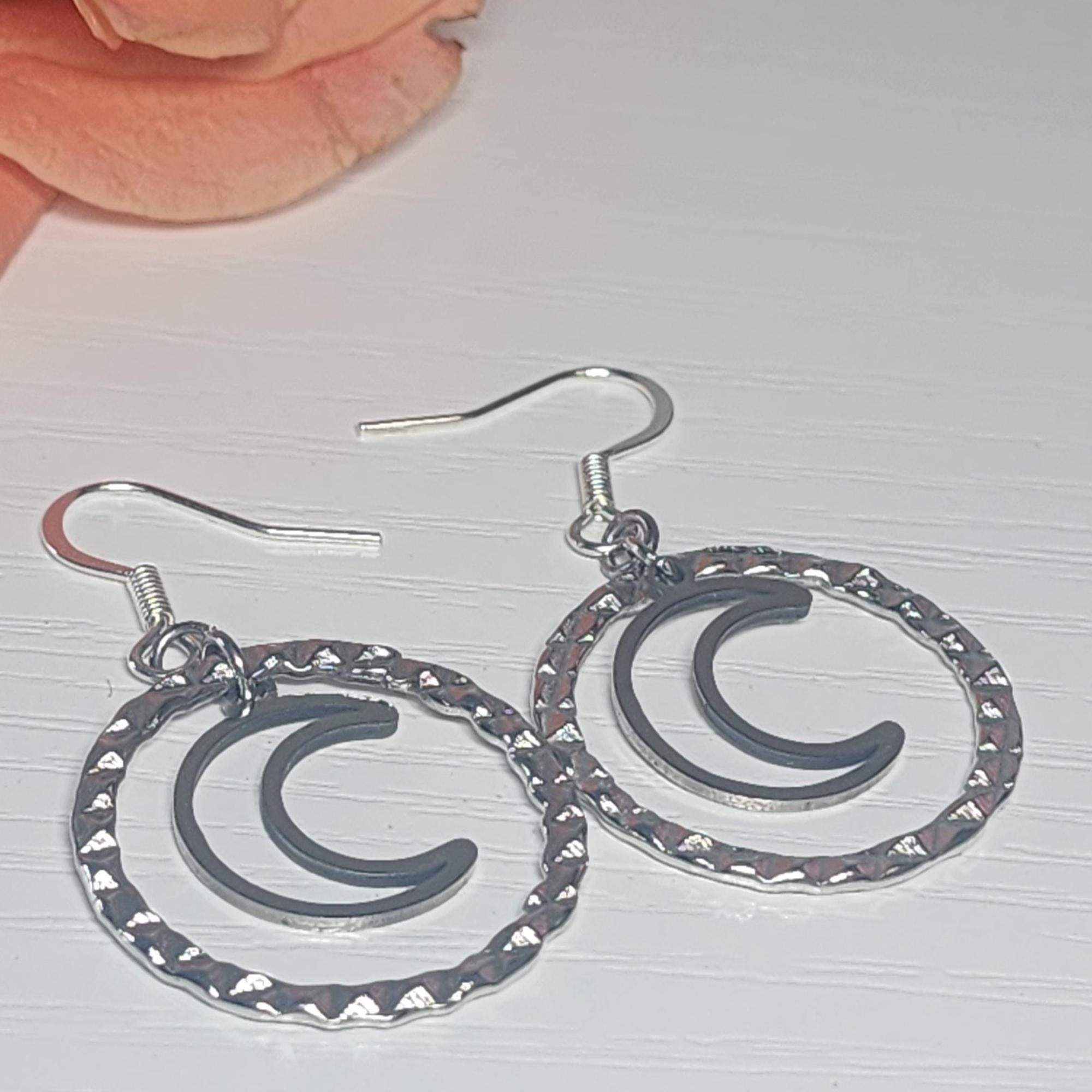 • Design: Crescent moon inside a silver textured hoop