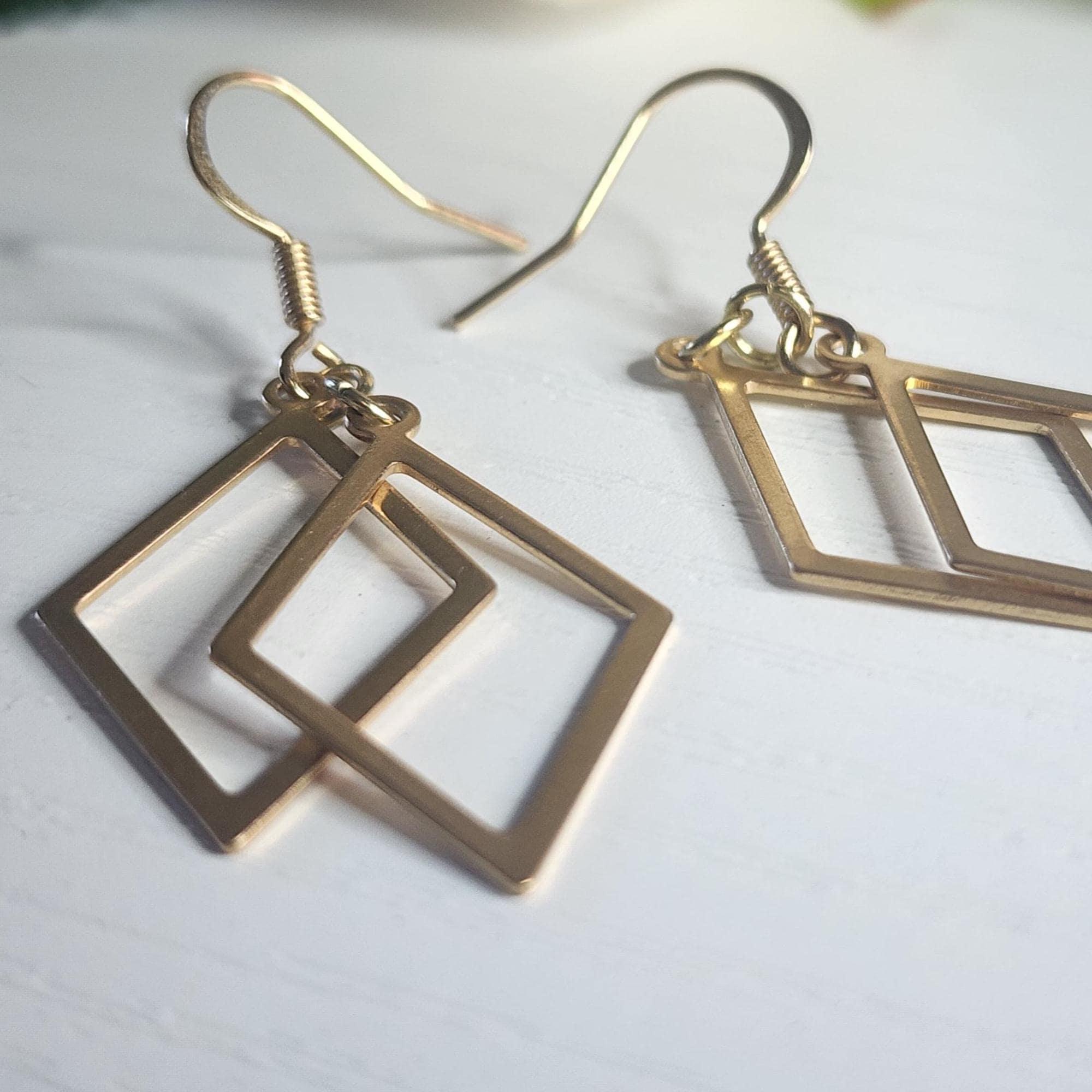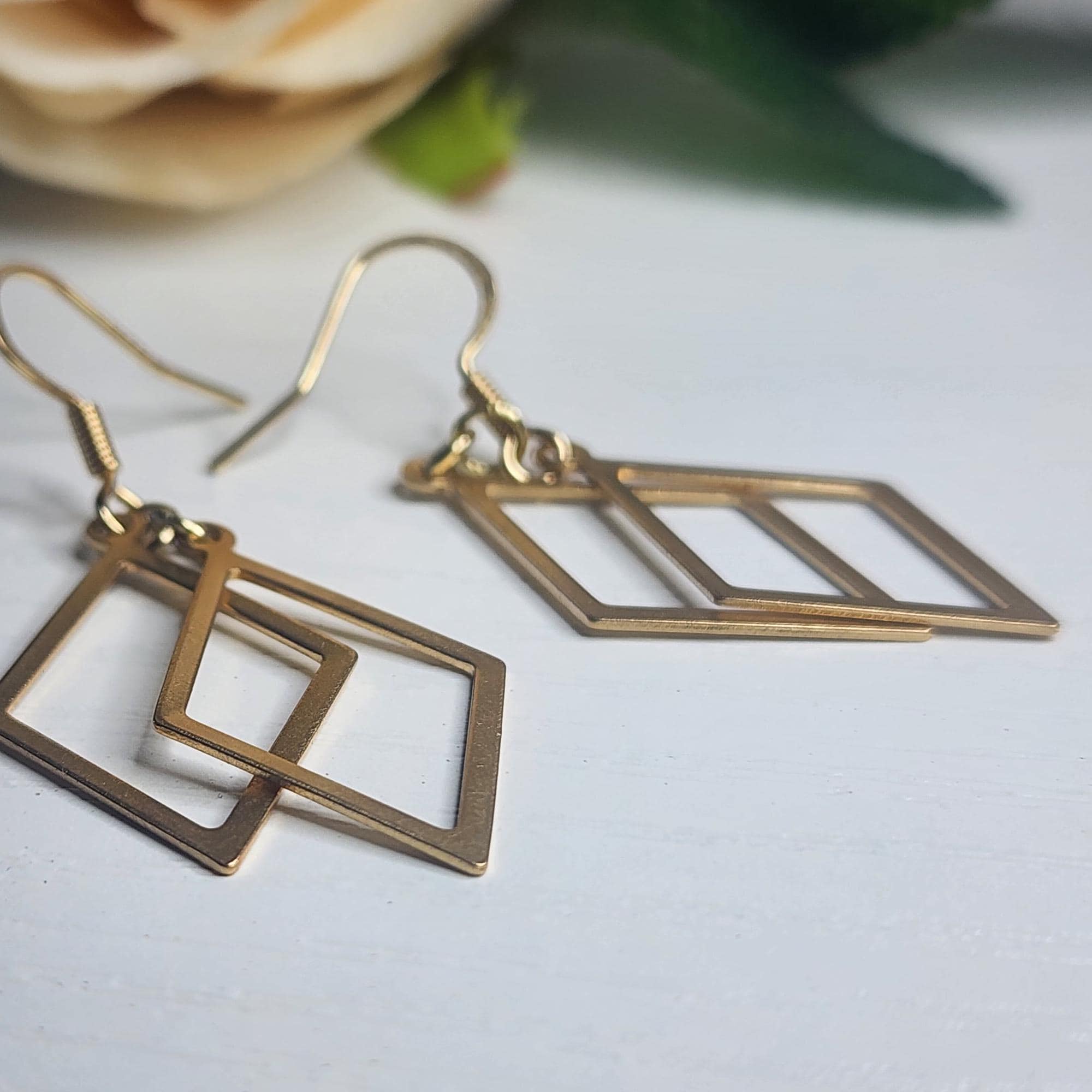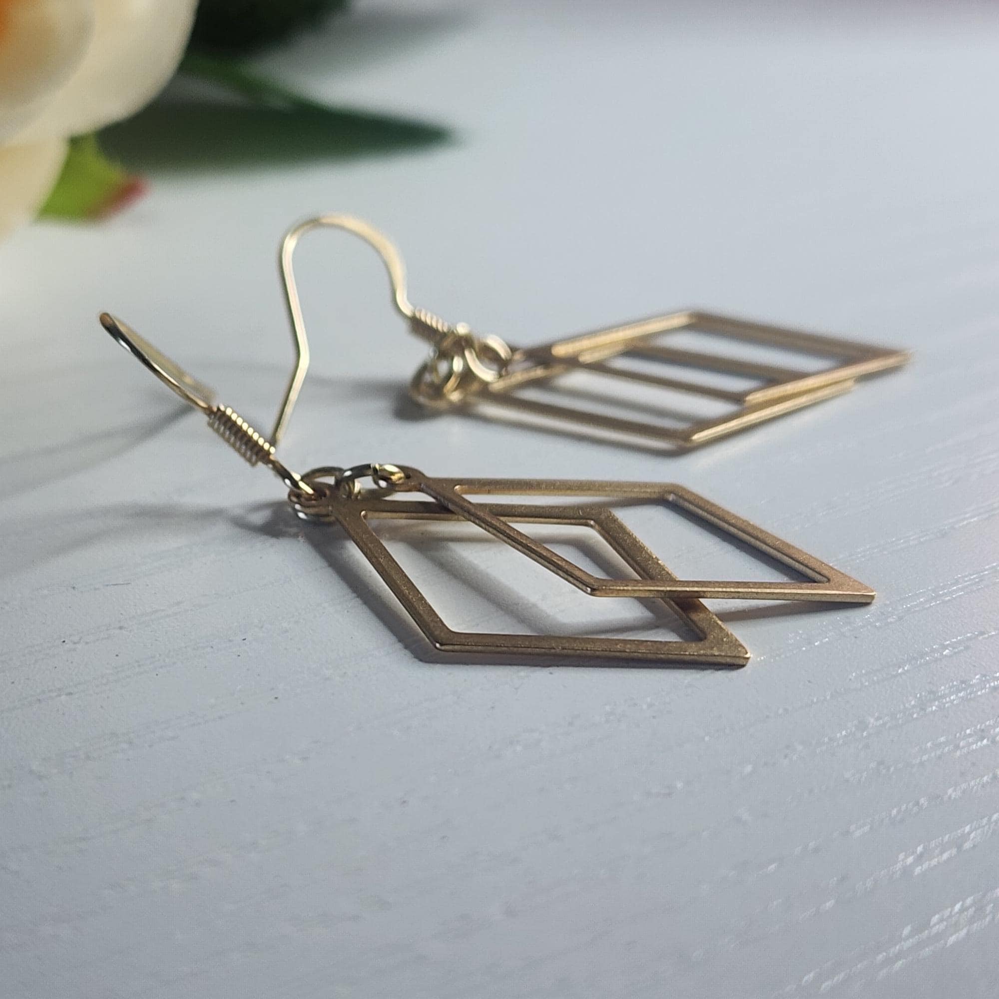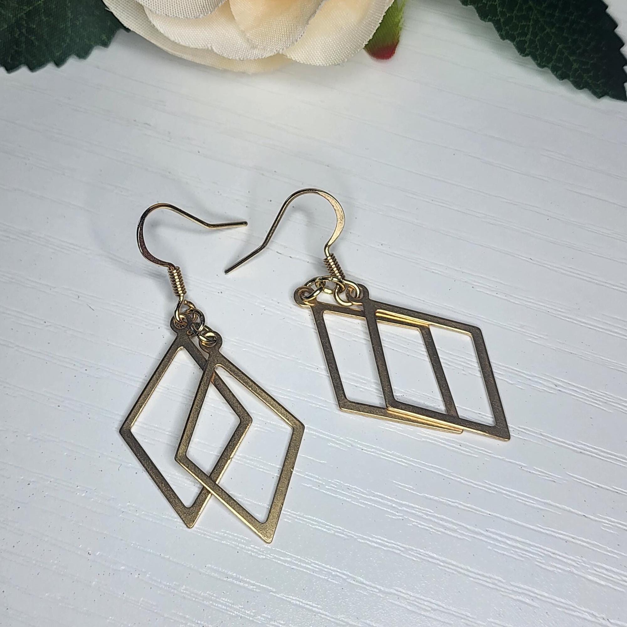 • Material: Gold-tone coated brass in a modern double-diamond drop (rhombus) design