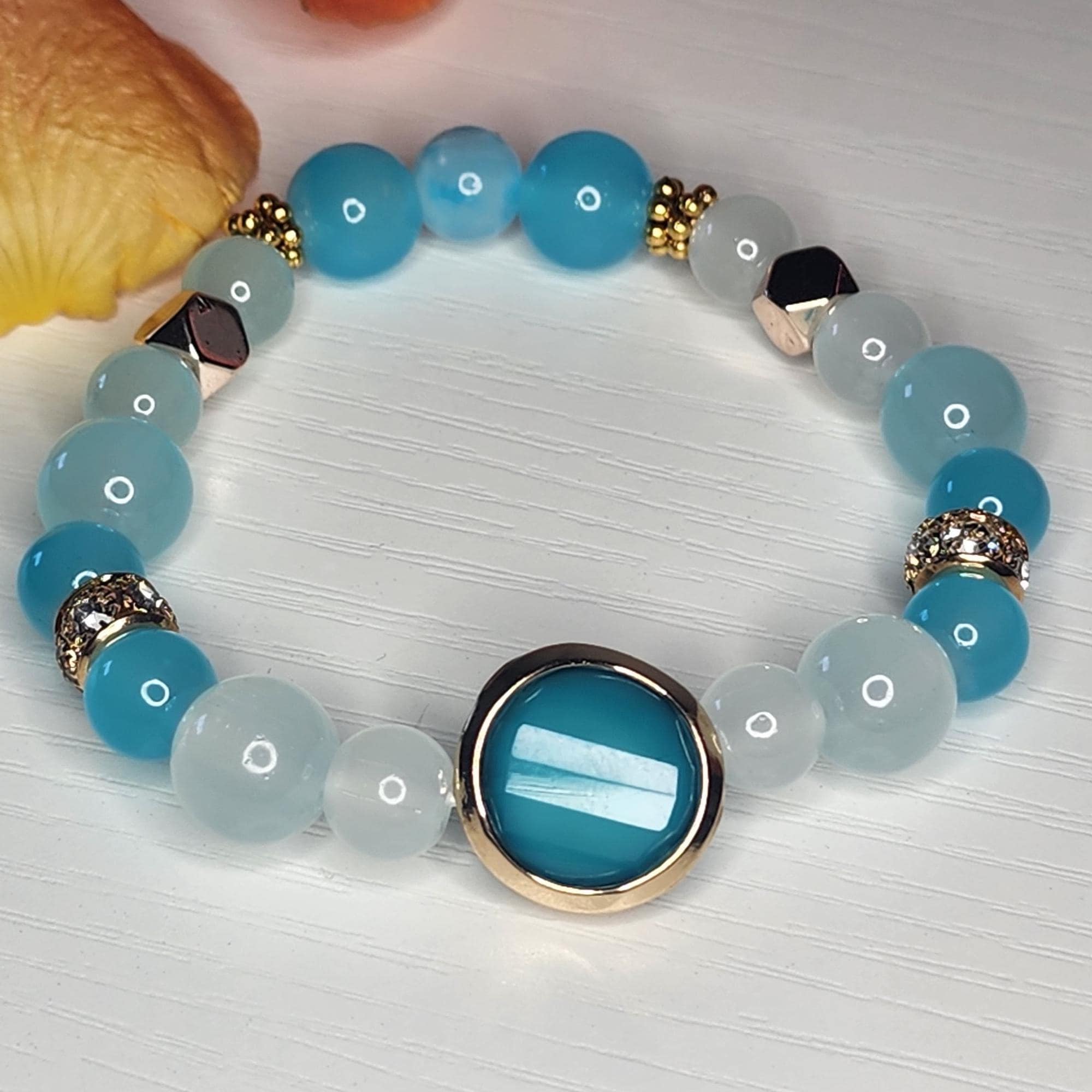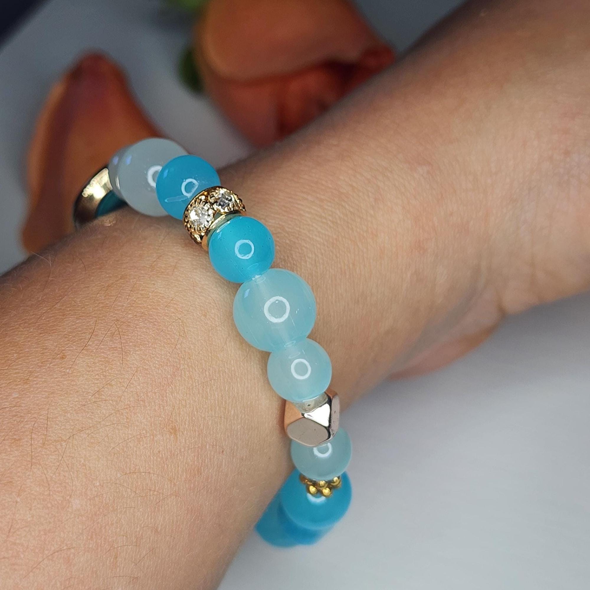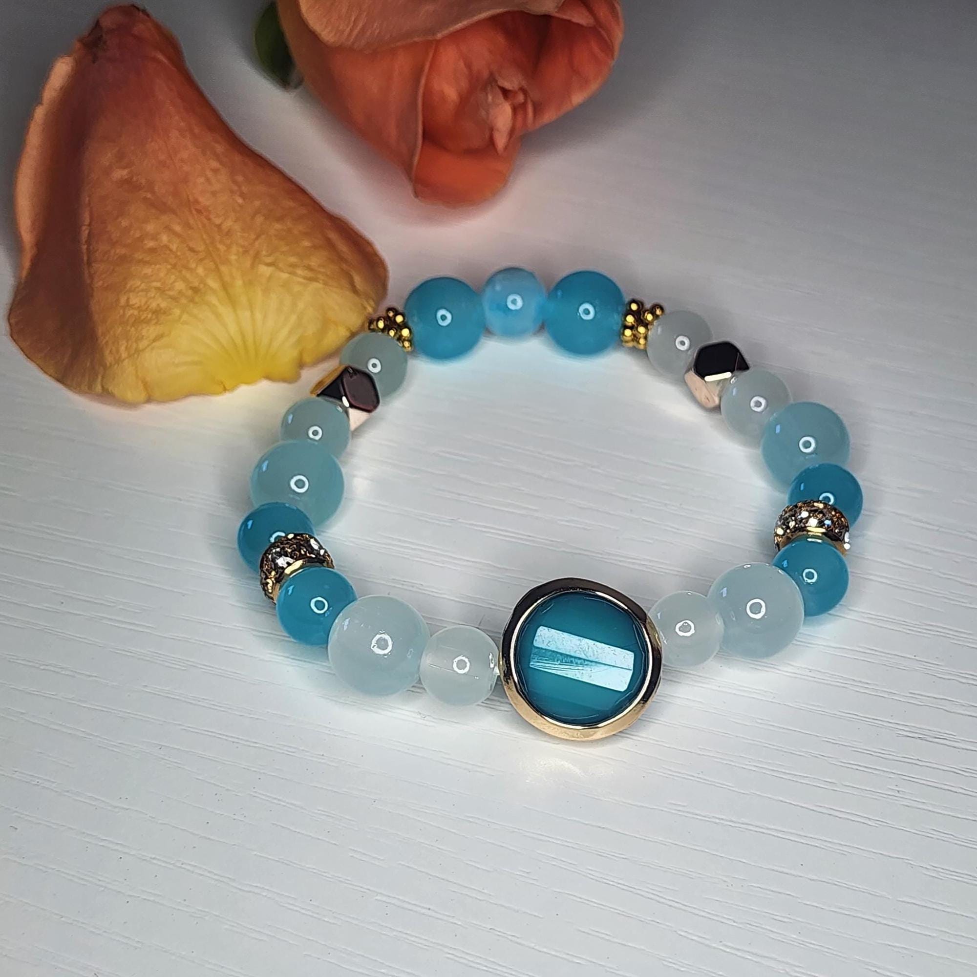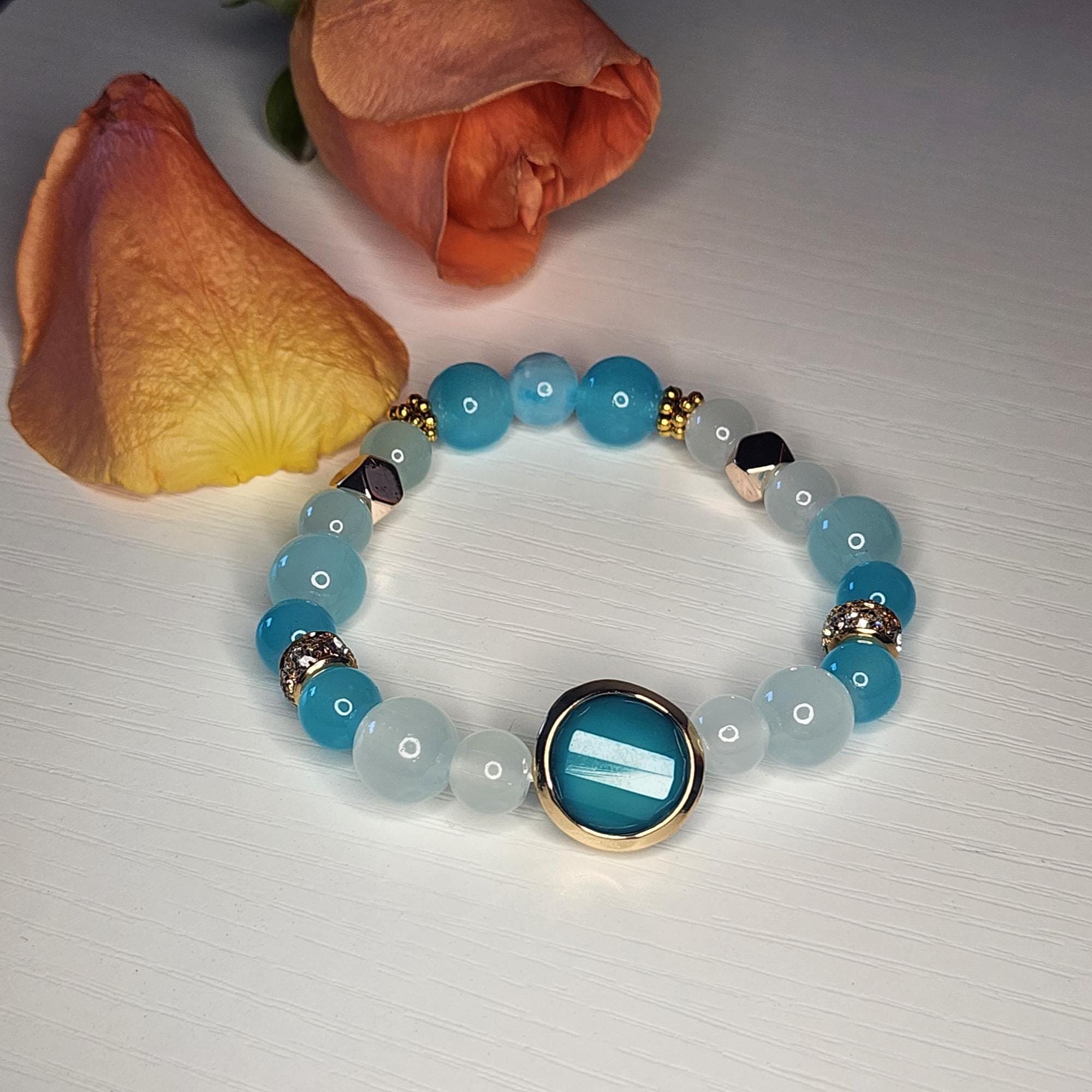 You were made to shine — with faith, purpose, and beauty. If you’re searching for jewelry that’s modern, versatile, and full of charm, this bracelet is your perfect match. Handmade with a stunning teal & gold faceted glass coin bead as the centerpiece, it’s paired with aqua ombré glass rounds, a single blue jade bead, and rose gold hematite cubes that add a chic metallic glow. Finished with sparkling rhinestone and flower spacers, this bracelet shines with just the right touch of elegance. Whether you’re dressing up for work, brunch with friends, or a casual night out, this bracelet makes every outfit feel special. Its versatile design blends minimalist sophistication with a pop of color—just what you need to showcase your unique style.