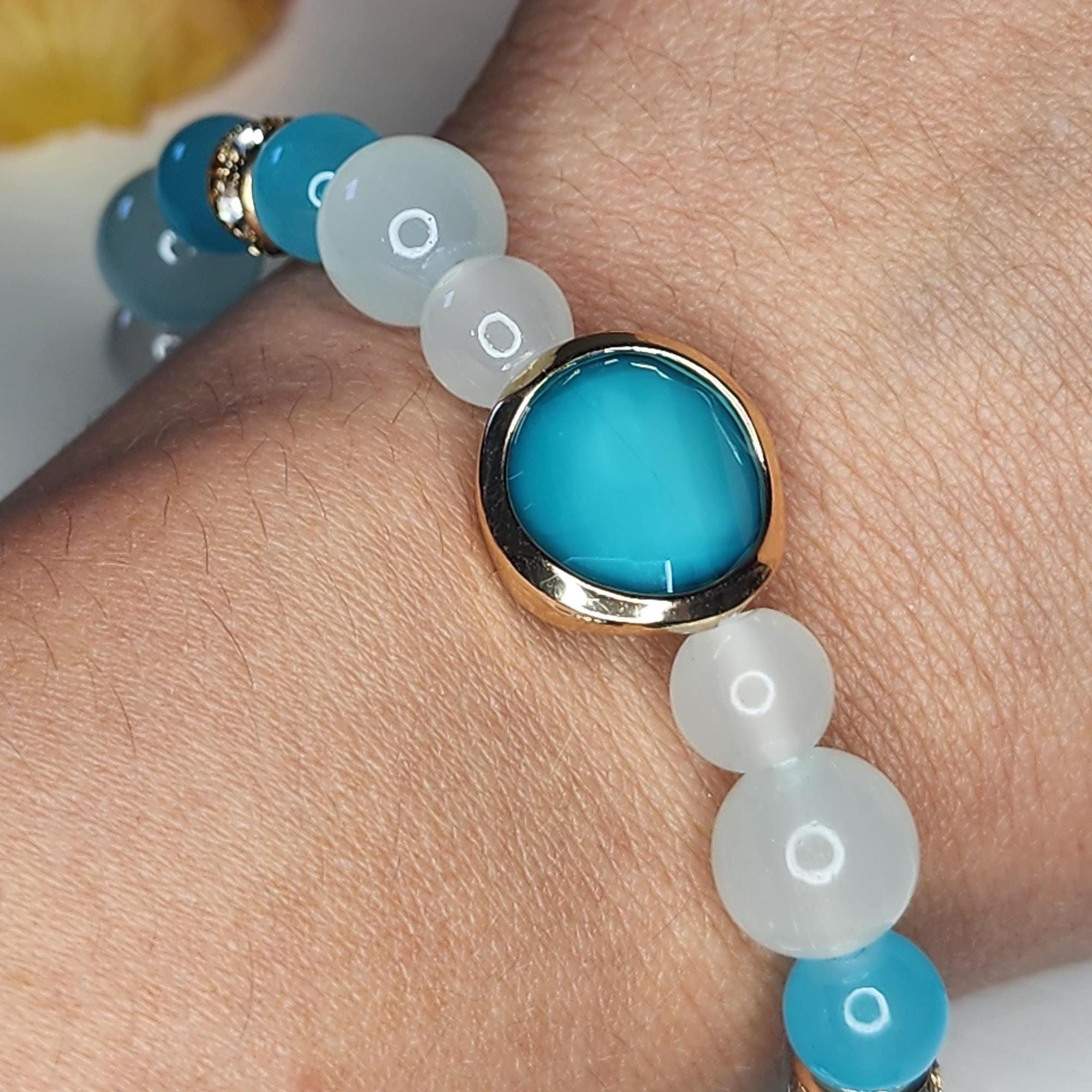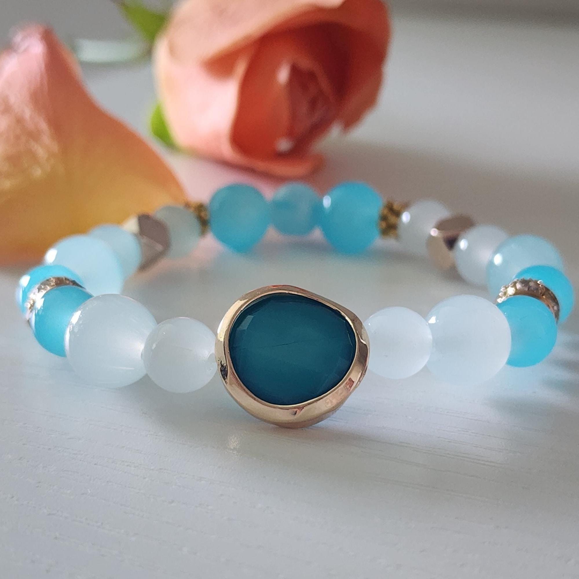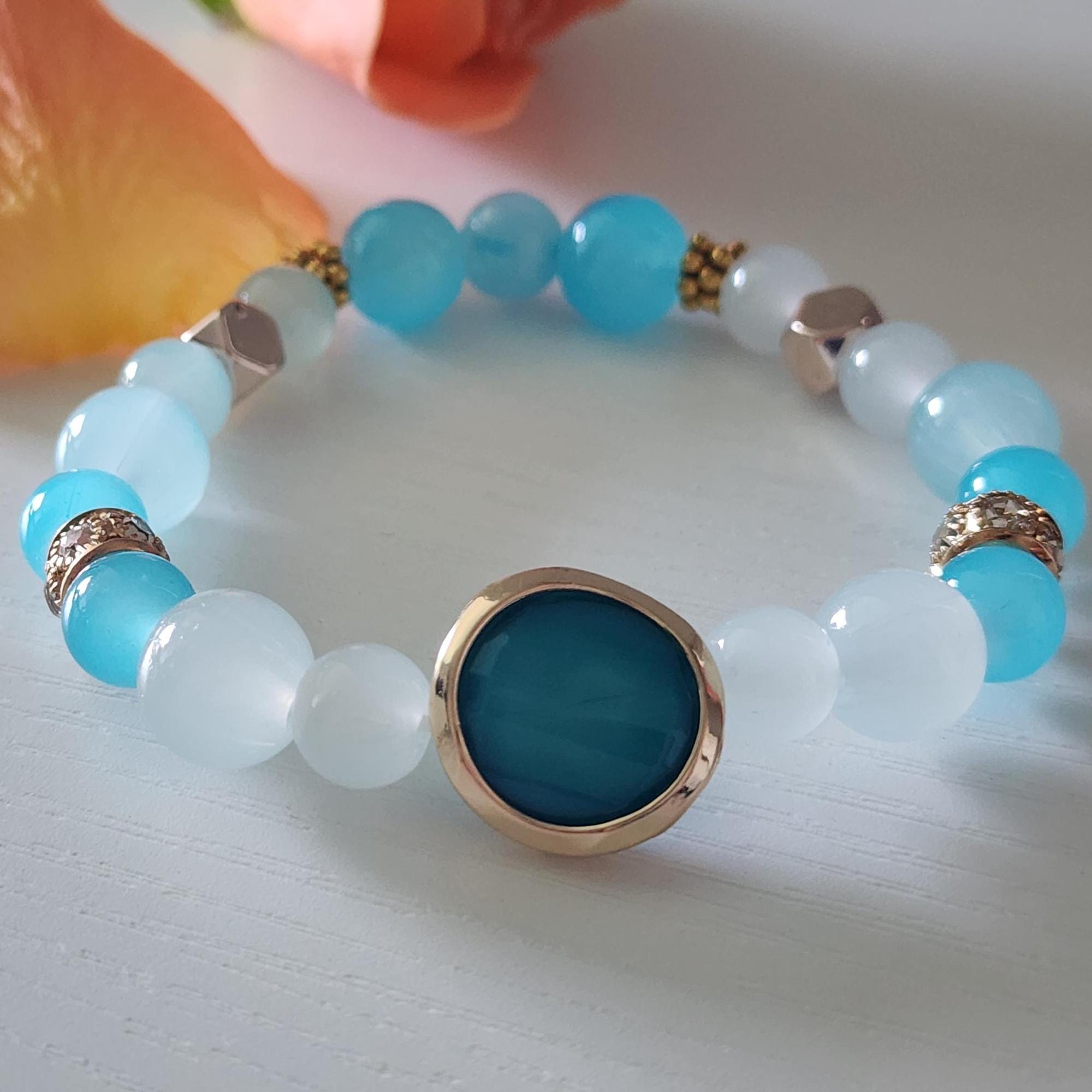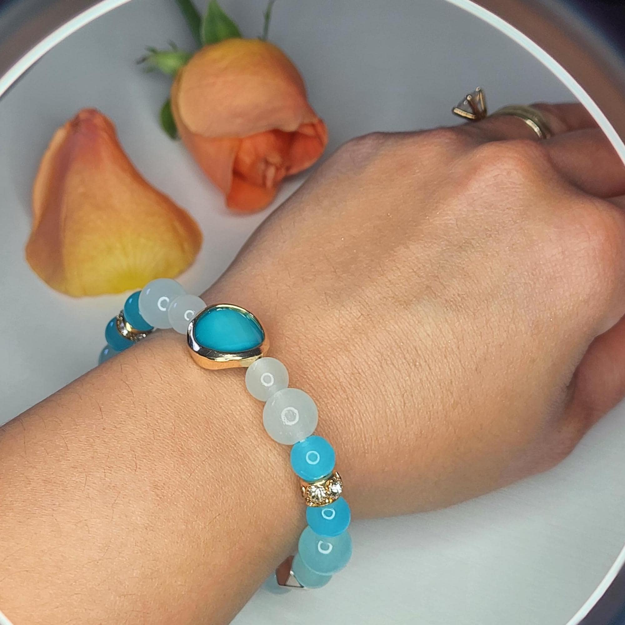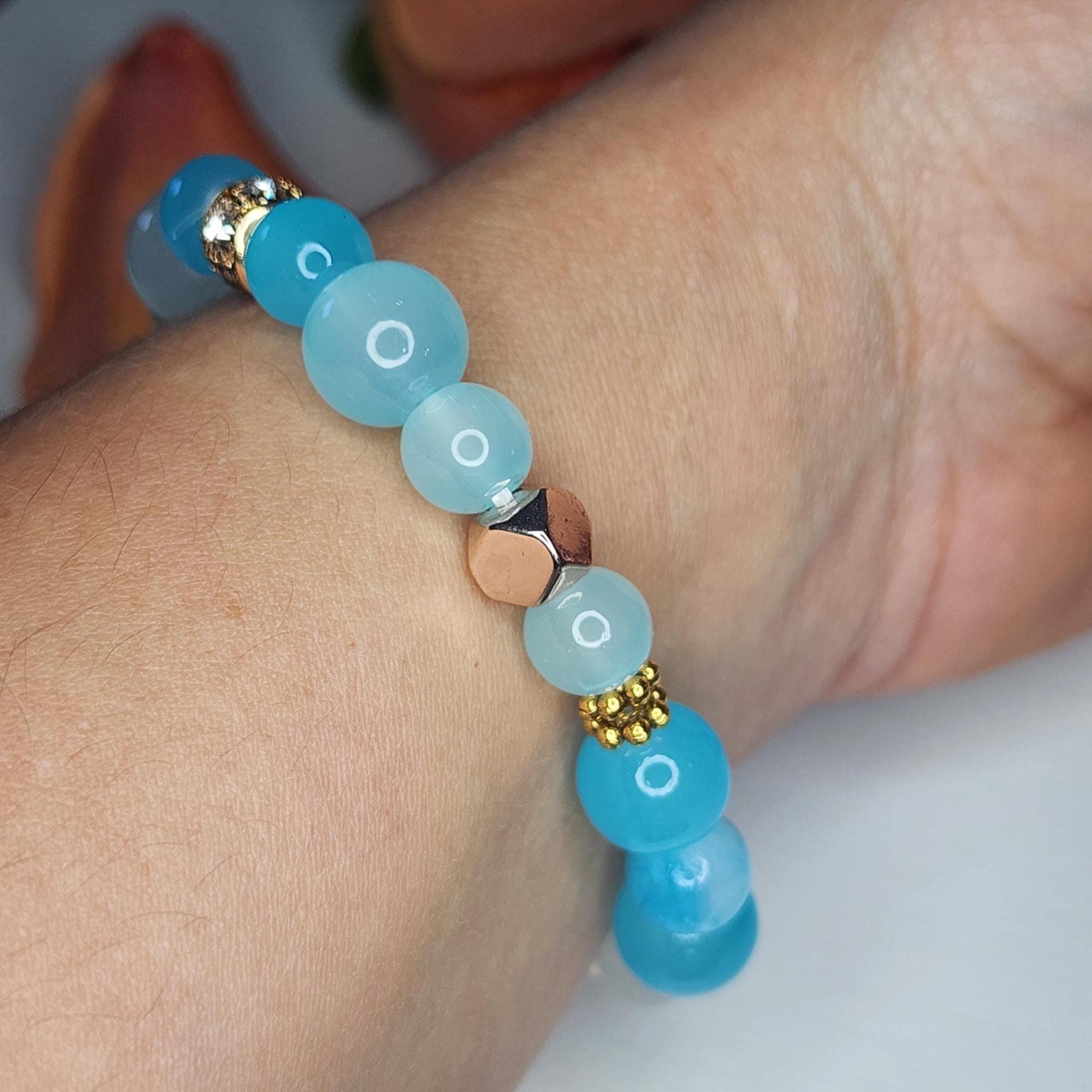 You were made to shine — with faith, purpose, and beauty. If you’re searching for jewelry that’s modern, versatile, and full of charm, this bracelet is your perfect match. Handmade with a stunning teal & gold faceted glass coin bead as the centerpiece, it’s paired with aqua ombré glass rounds, a single blue jade bead, and rose gold hematite cubes that add a chic metallic glow. Finished with sparkling rhinestone and flower spacers, this bracelet shines with just the right touch of elegance. Whether you’re dressing up for work, brunch with friends, or a casual night out, this bracelet makes every outfit feel special. Its versatile design blends minimalist sophistication with a pop of color—just what you need to showcase your unique style.