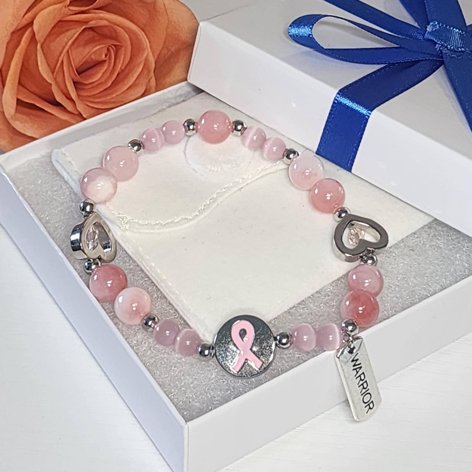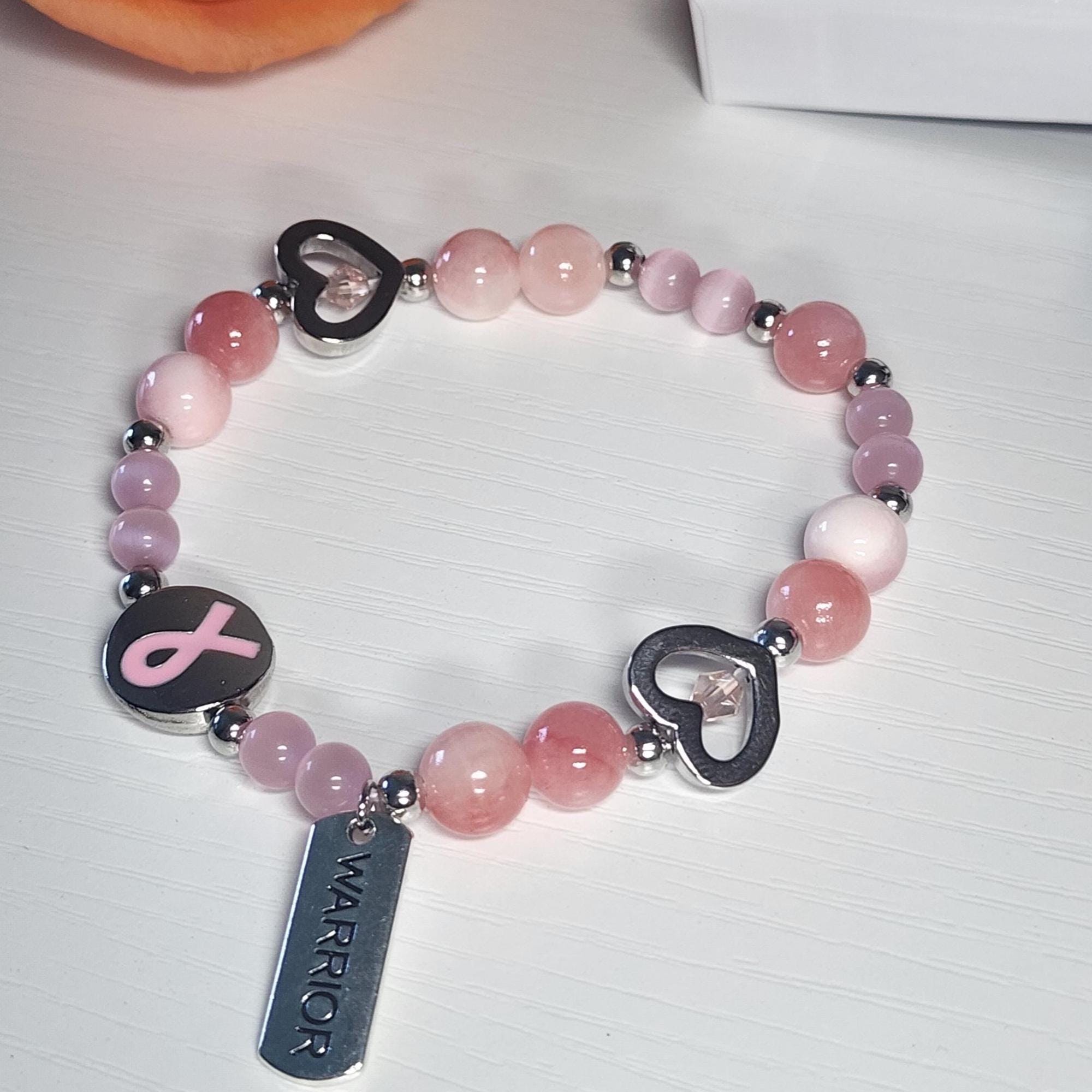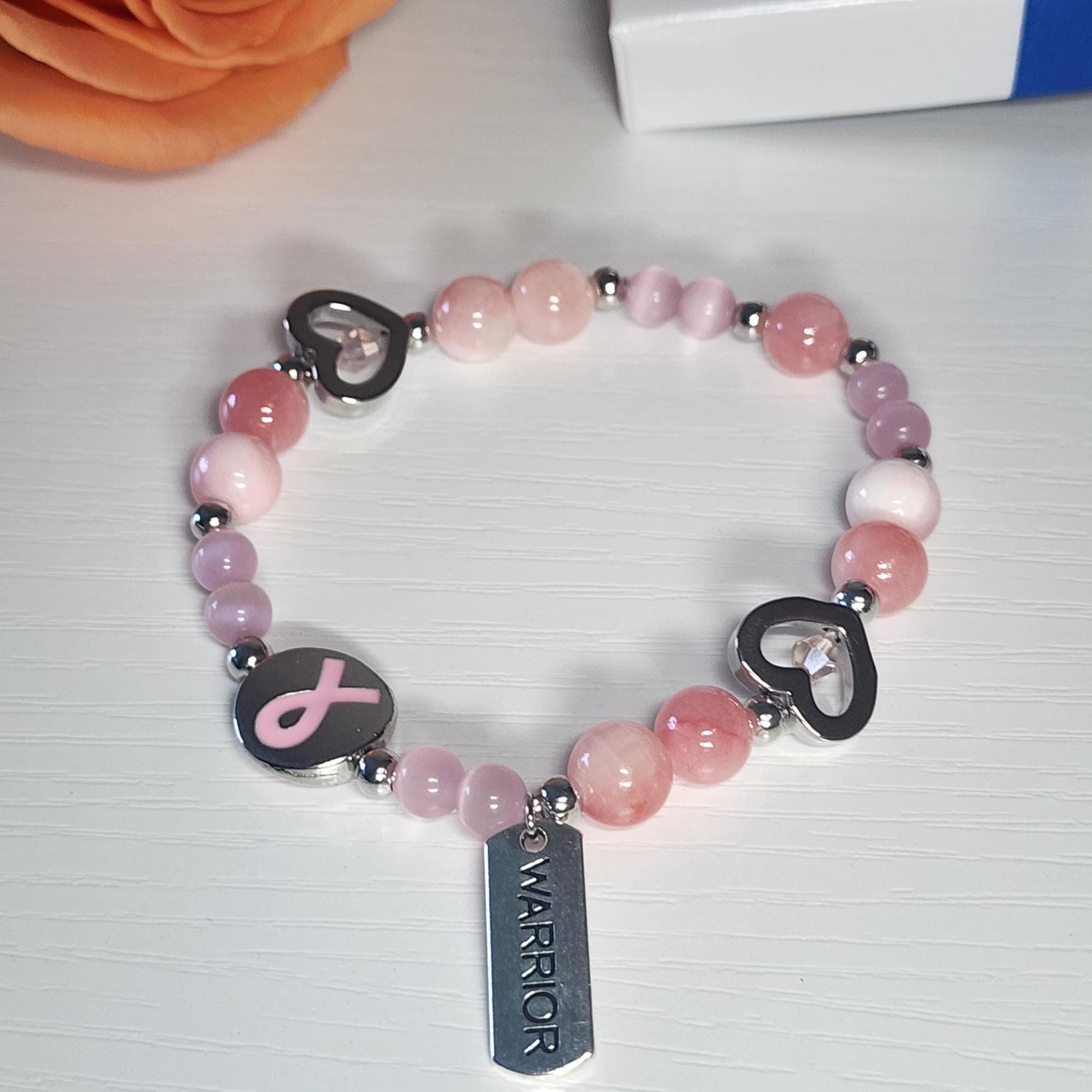 Each bracelet is carefully handmade using pink white jade, pink cat eye stone, and a delicate pink ribbon charm — symbolizing courage, love, and healing. Trust me, this pink ribbon jewelry makes a thoughtful keepsake ready to be treasured the moment it’s received.