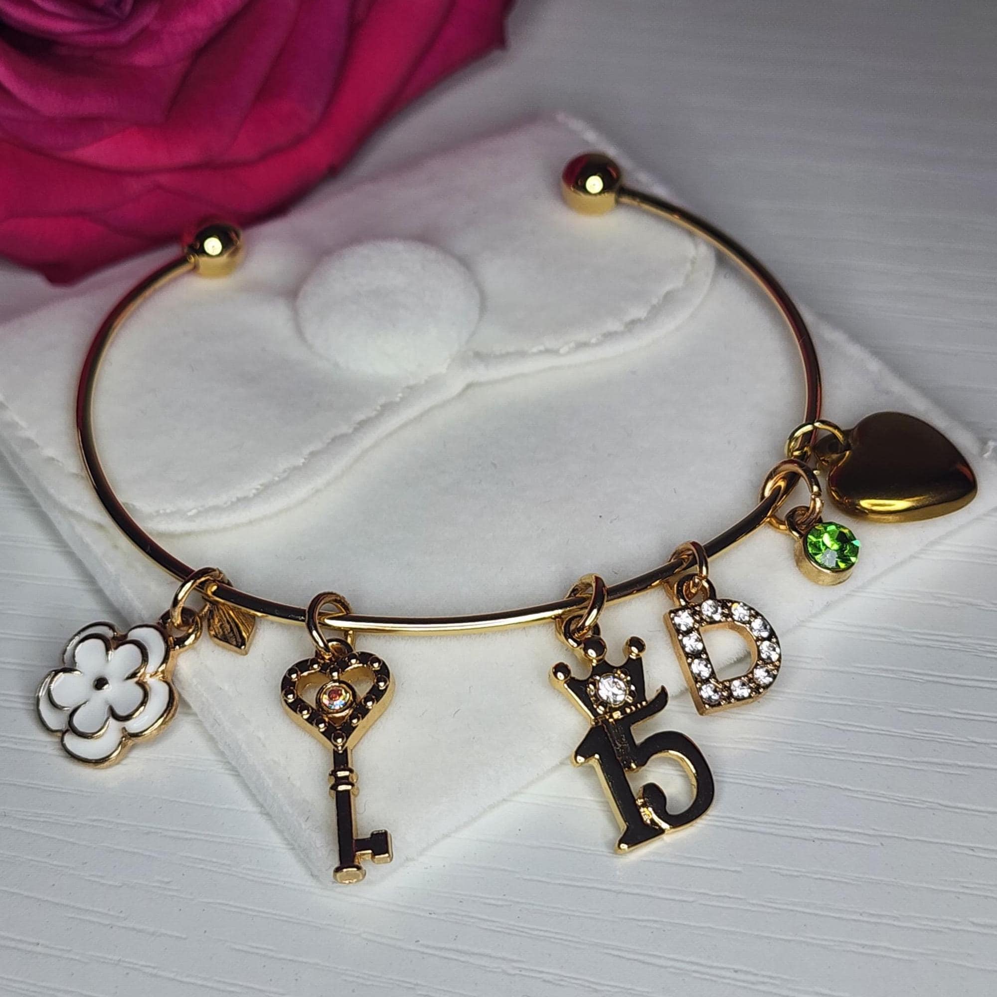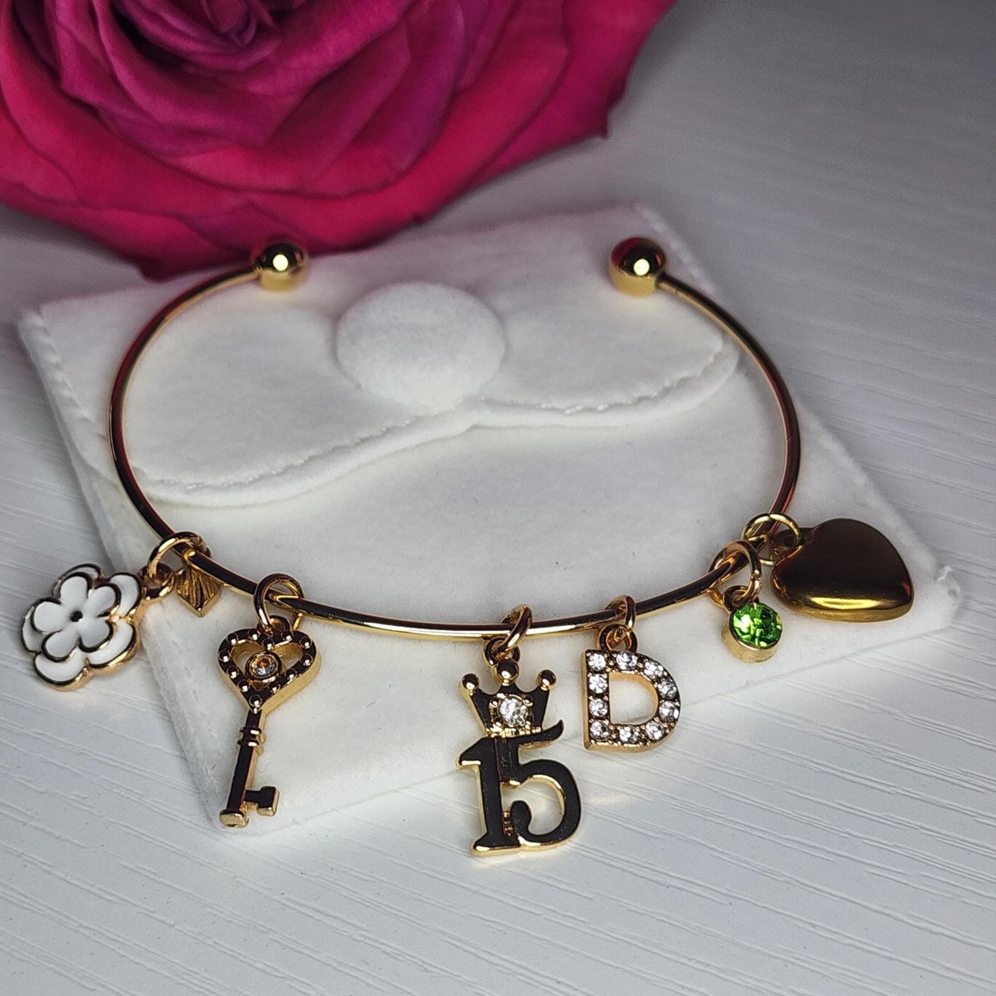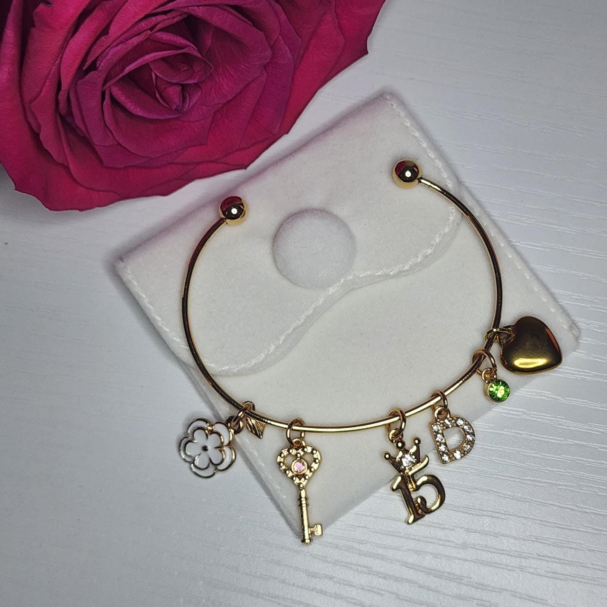 • Includes: 14K gold-plated crown “15” charm, stainless steel heart charm, enamel 3D flower charm, white stone gold initial charm, birthstone charm, and gold & rhodium key charm