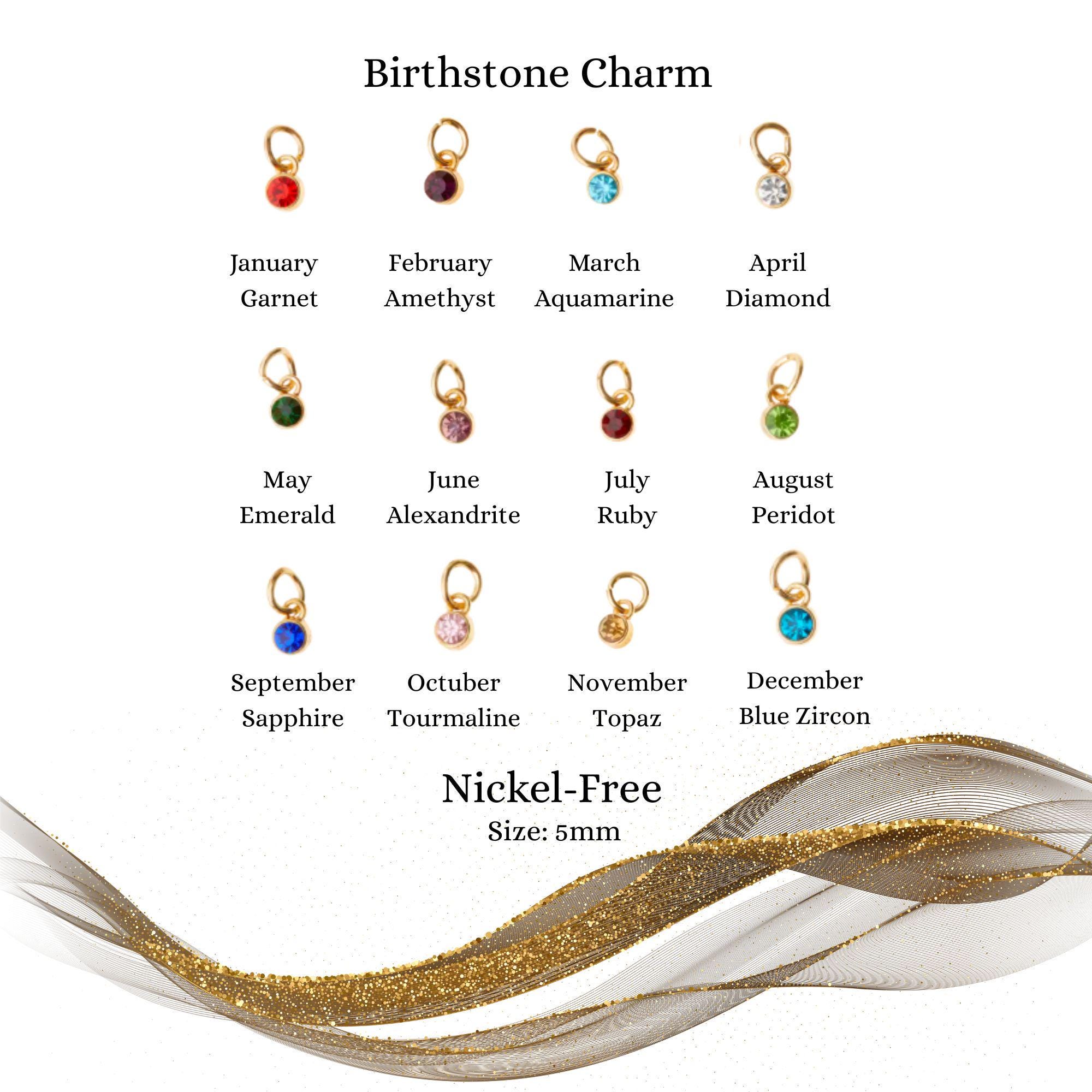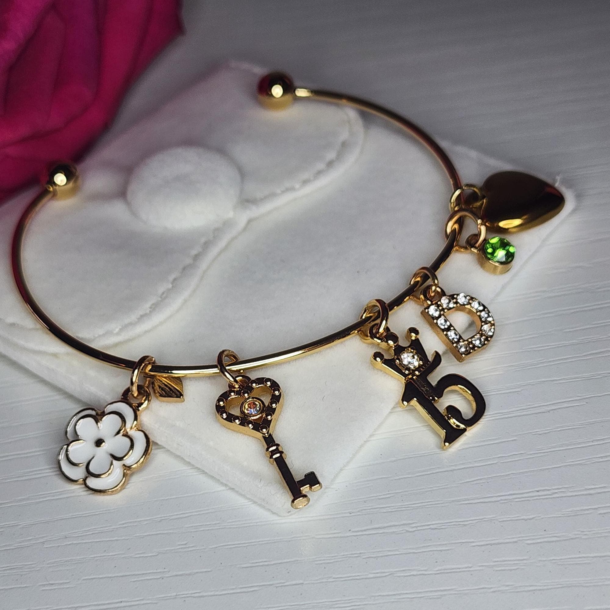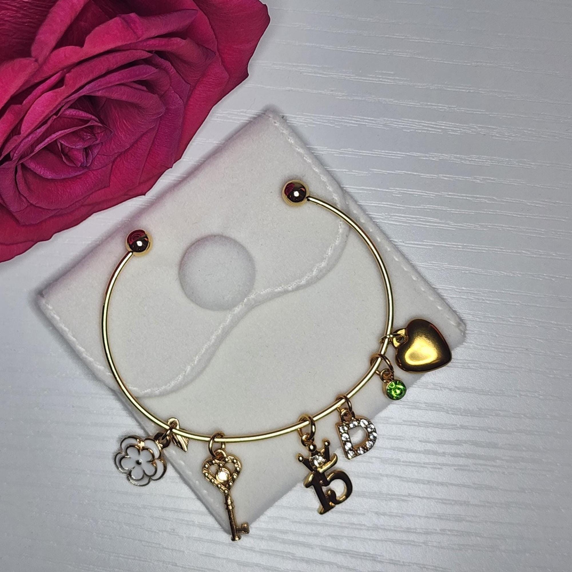 • Includes: 14K gold-plated crown “15” charm, stainless steel heart charm, enamel 3D flower charm, white stone gold initial charm, birthstone charm, and gold & rhodium key charm