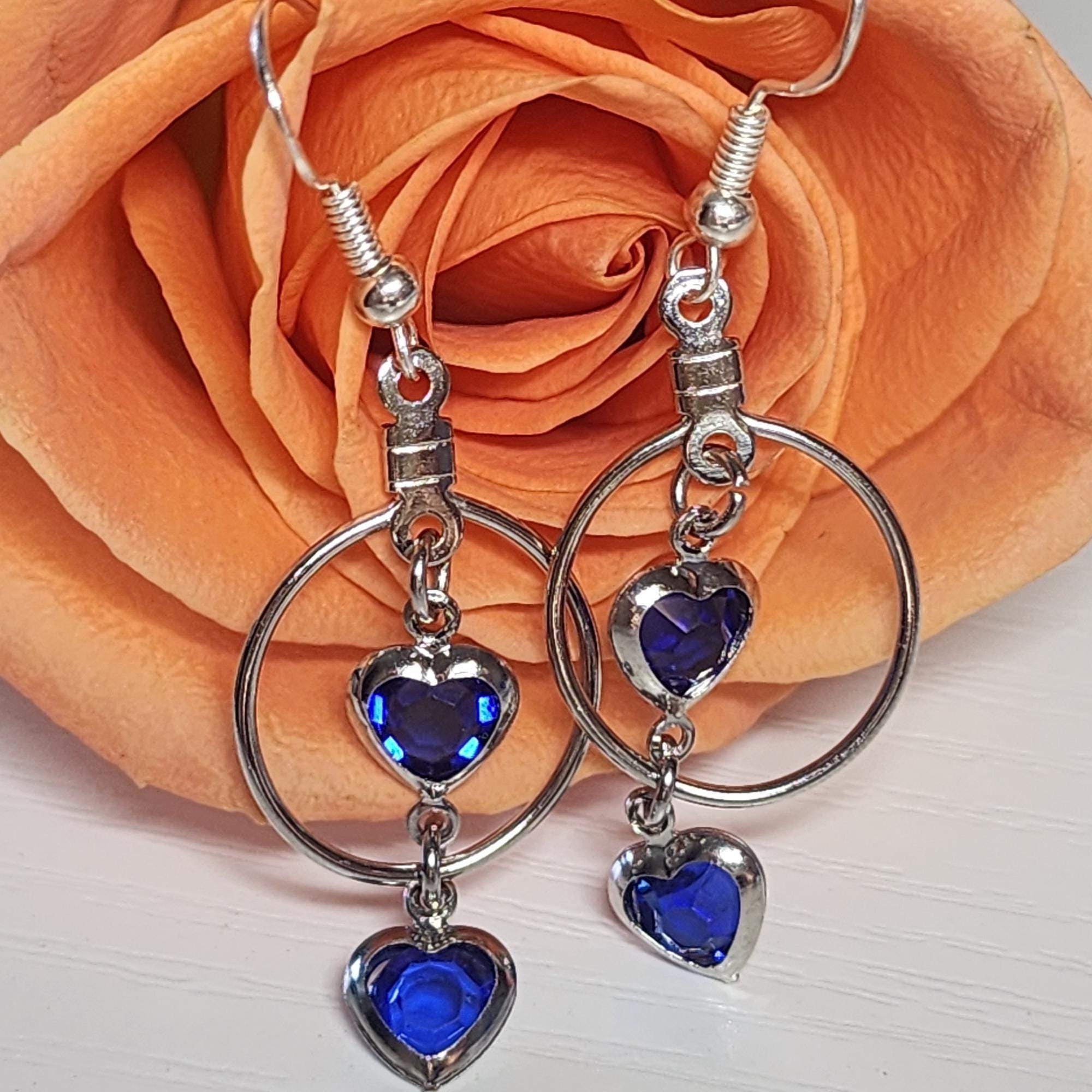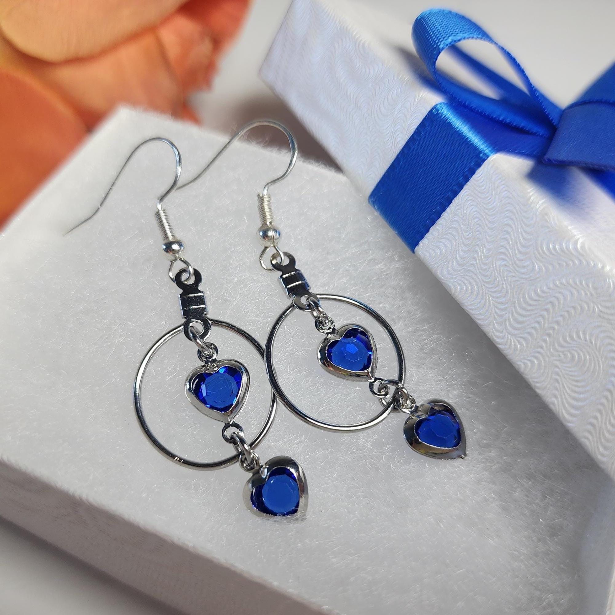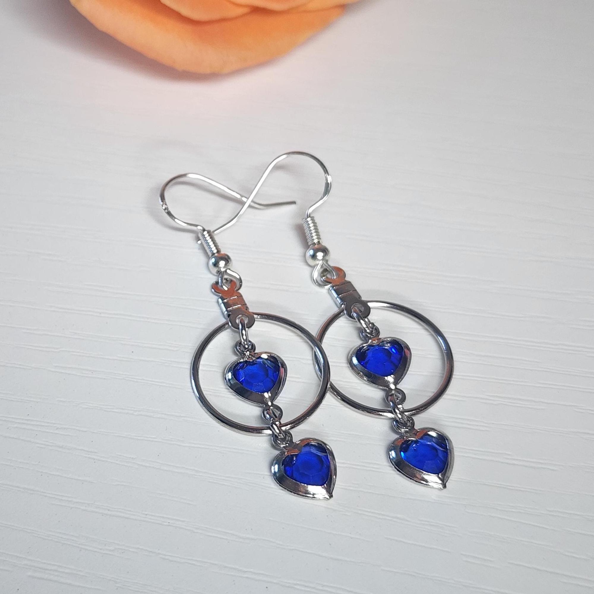 Hey there! Looking for earrings that sparkle with elegance and a pop of color? These Heart Crystal Drop Earrings are the perfect mix of modern minimalism and romantic charm. Each earring features two faceted blue heart crystals framed in polished silver-tone metal — one resting delicately inside a hoop and another dangling gracefully below it. The result? A design that moves beautifully with every turn of your head and catches the light just right.