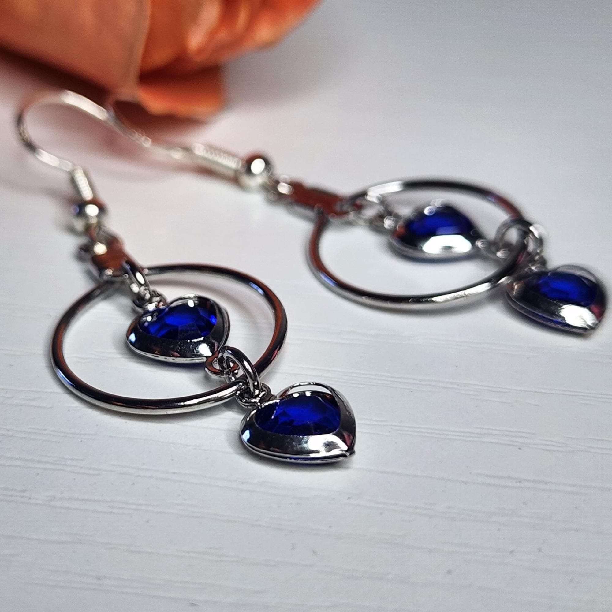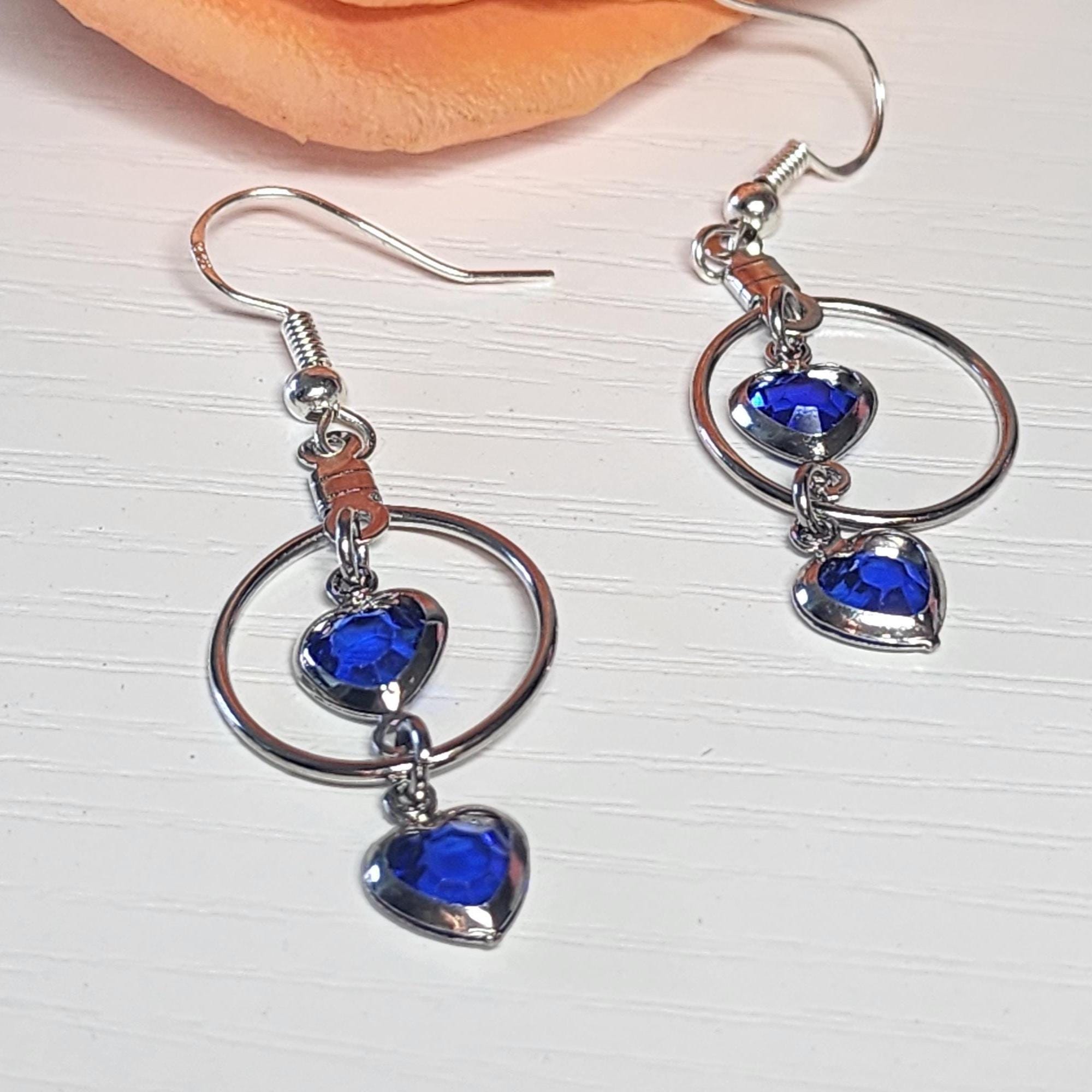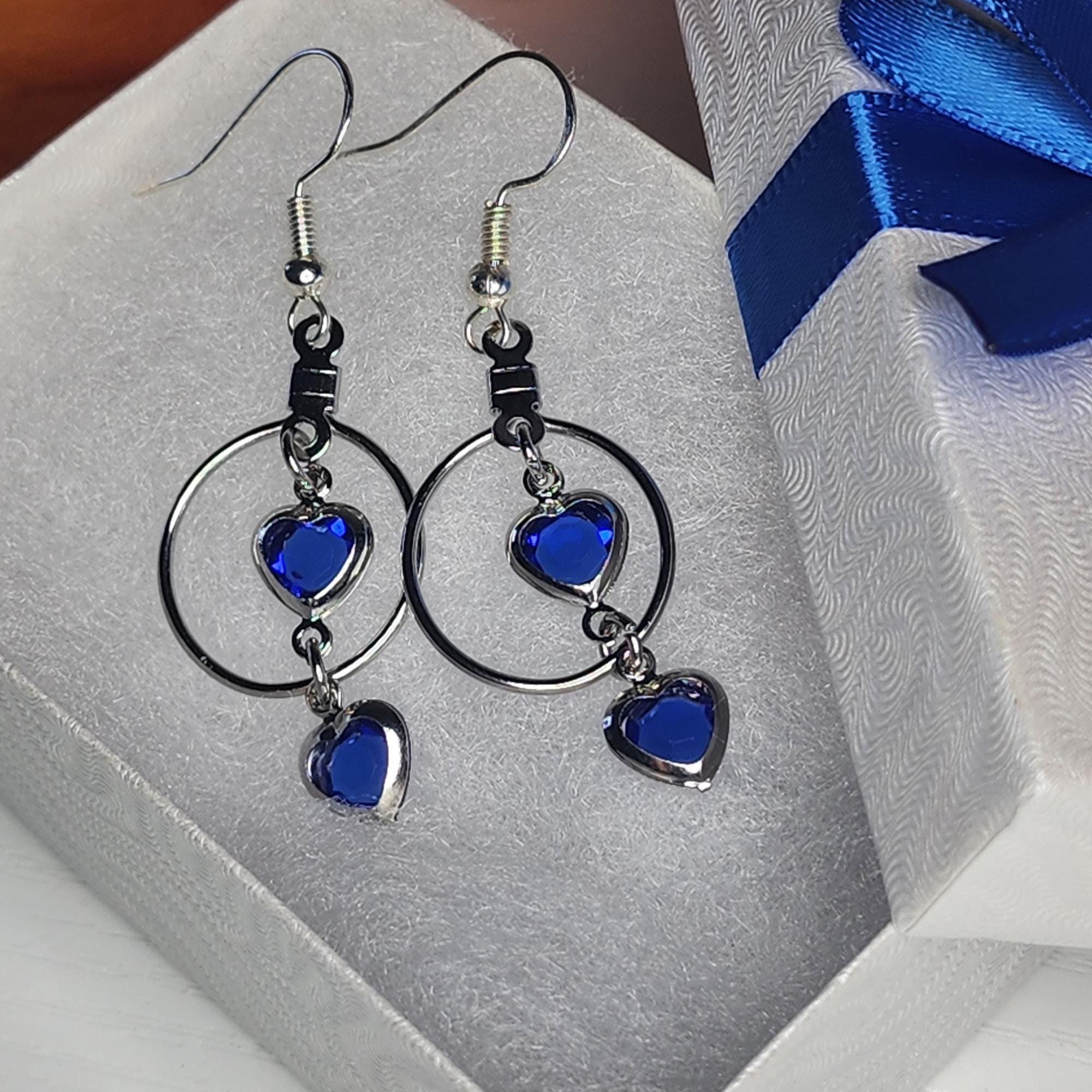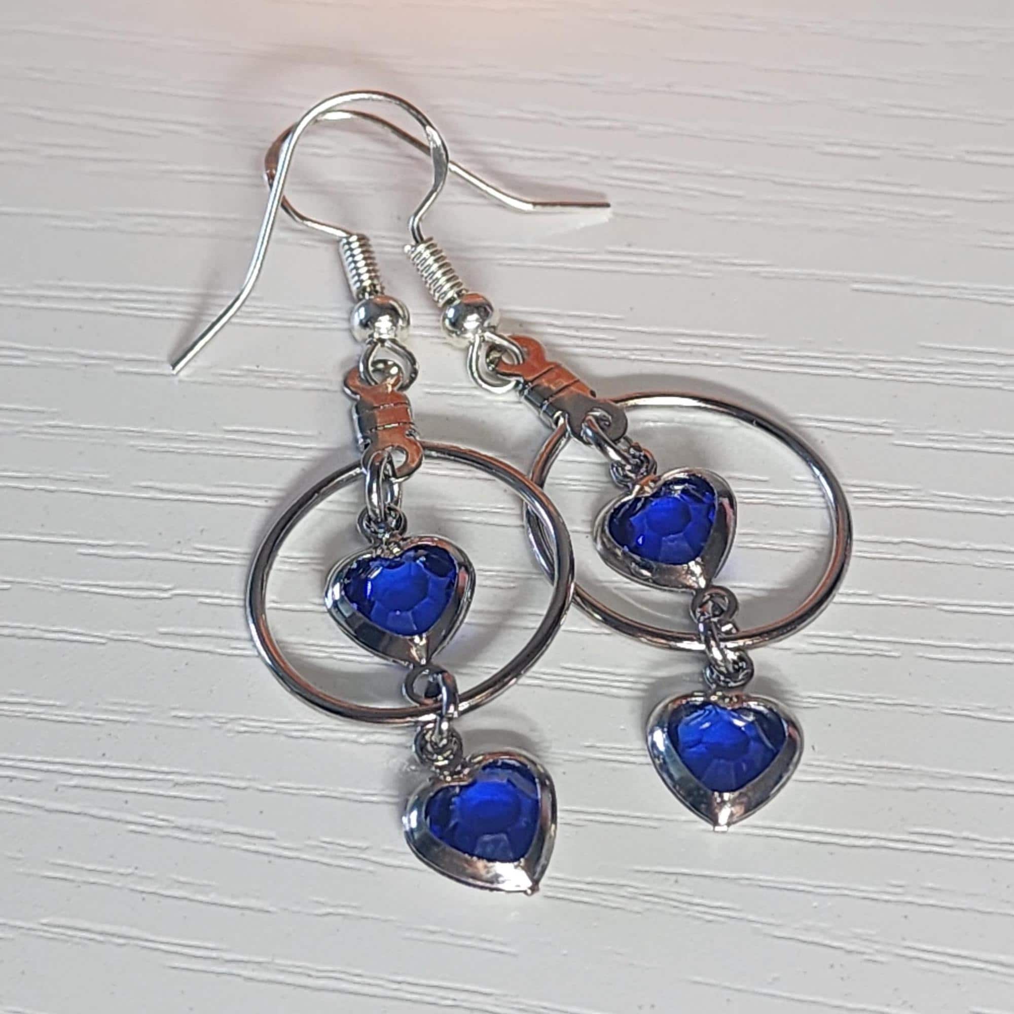 • Materials: Silver-tone metal, faceted blue crystal hearts