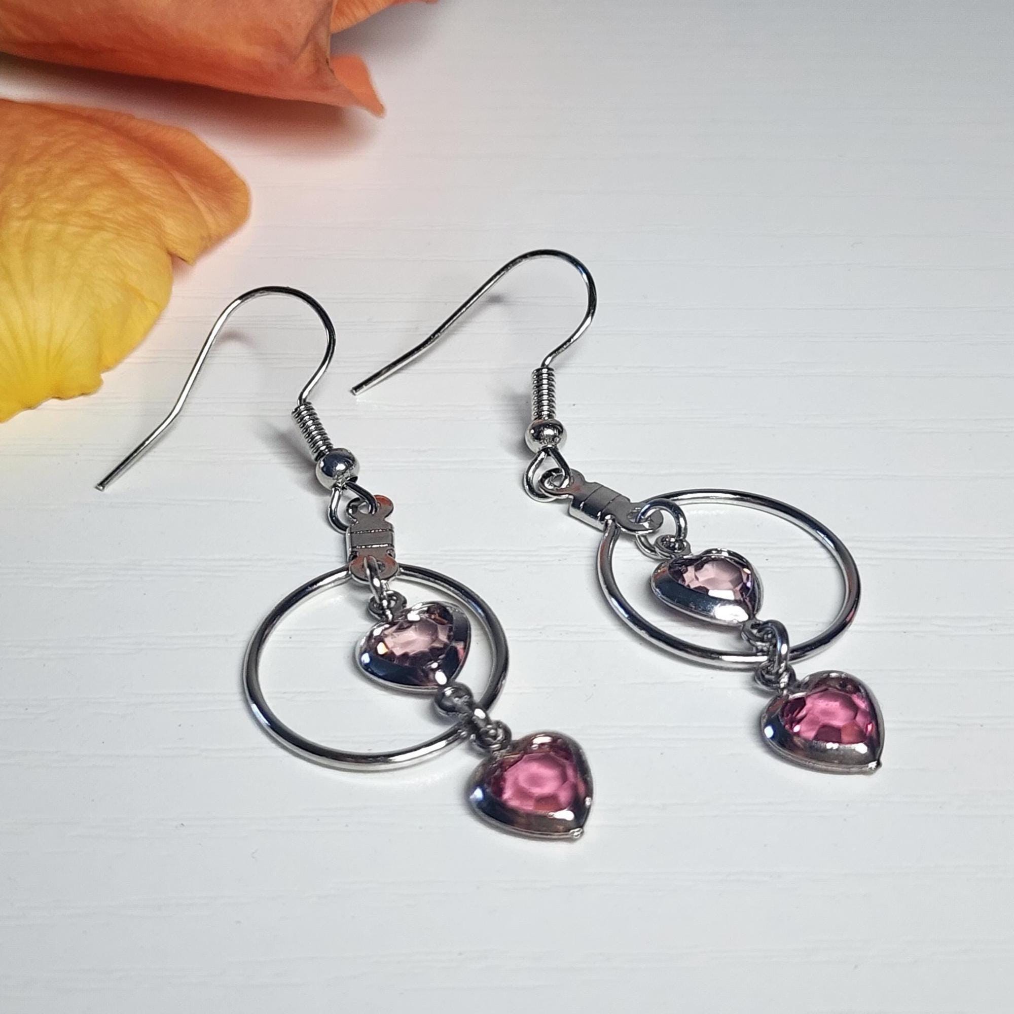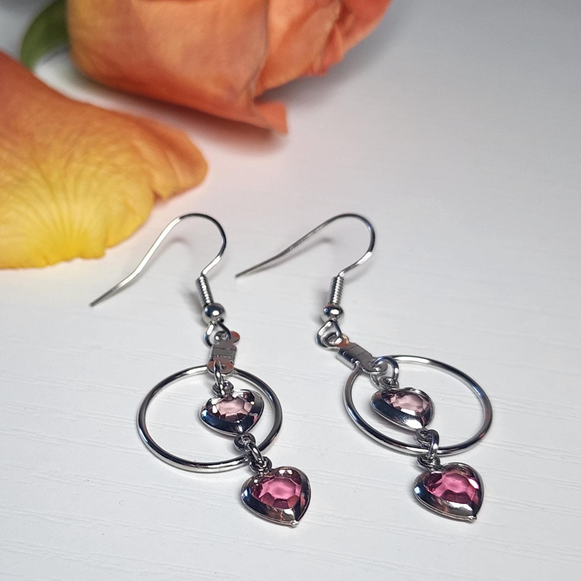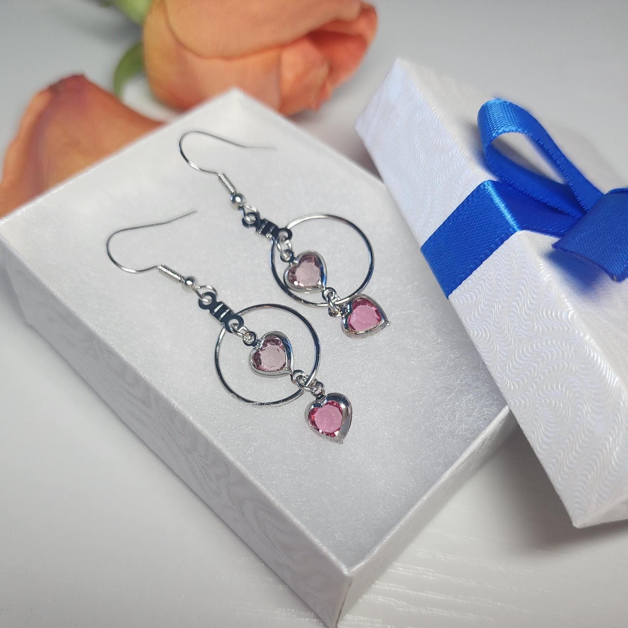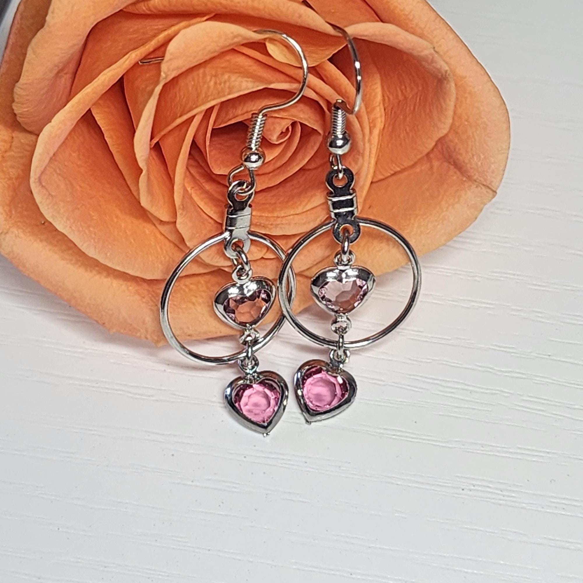 Hey there! Looking for earrings that sparkle with elegance and a pop of color? These Heart Crystal Drop Earrings are the perfect mix of modern minimalism and romantic charm. Each earring features two faceted pink heart crystals framed in polished silver-tone metal — one resting delicately inside a hoop and another dangling gracefully below it. The result? A design that moves beautifully with every turn of your head and catches the light just right.