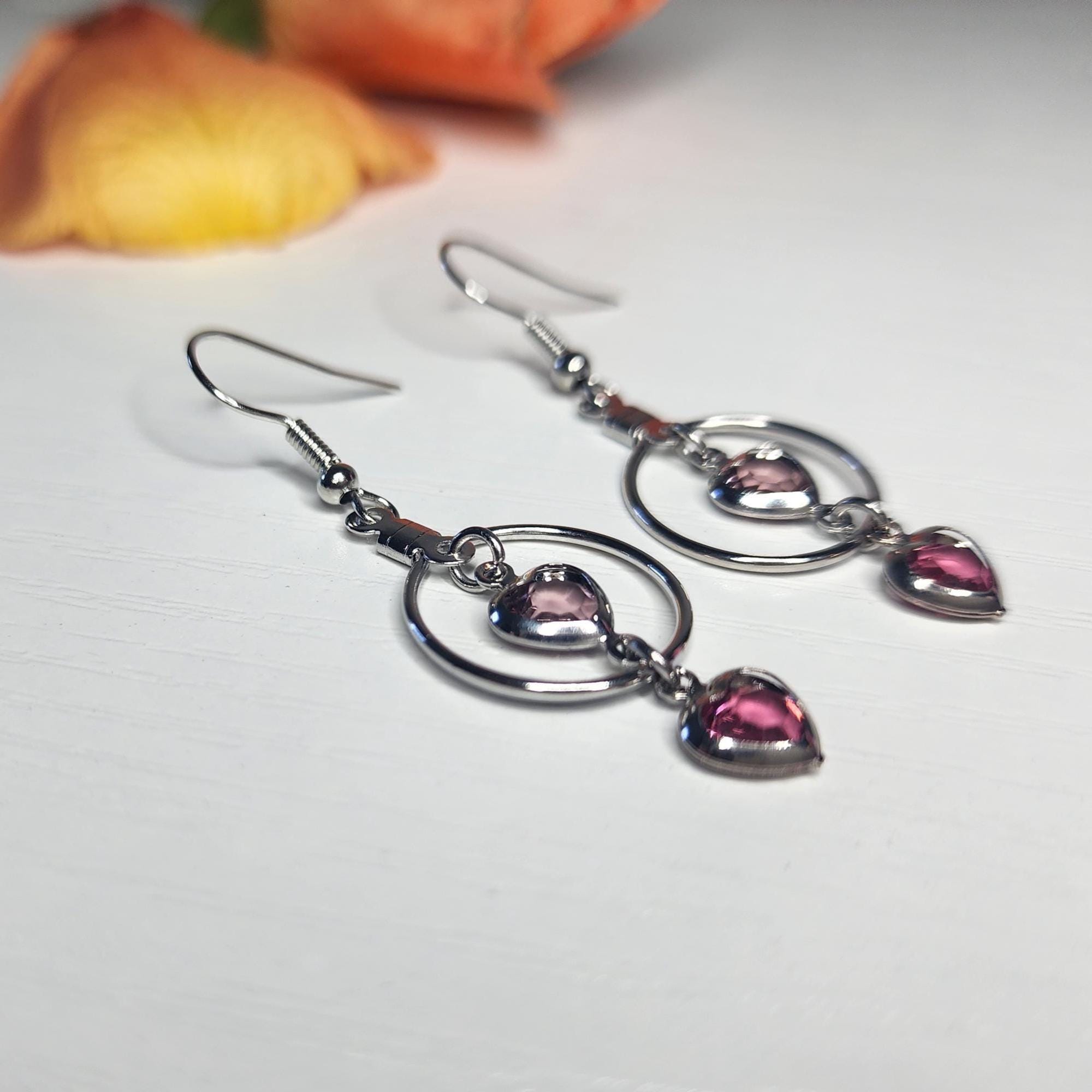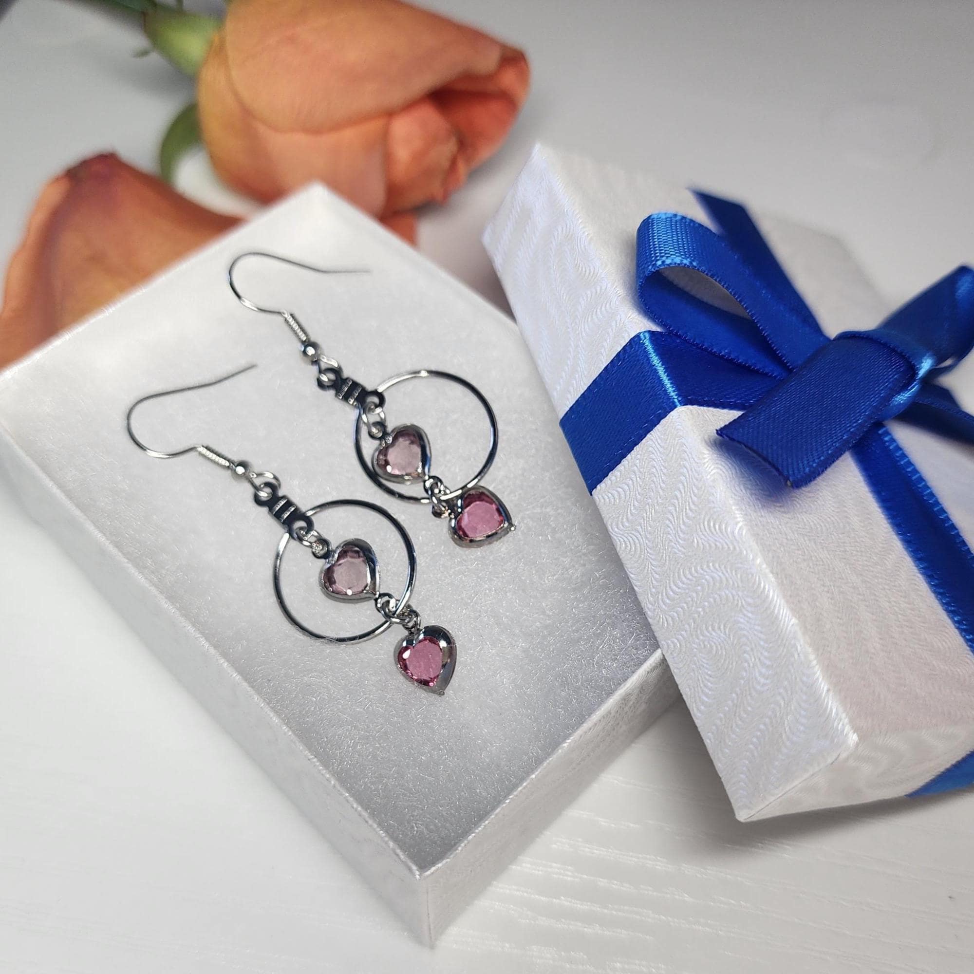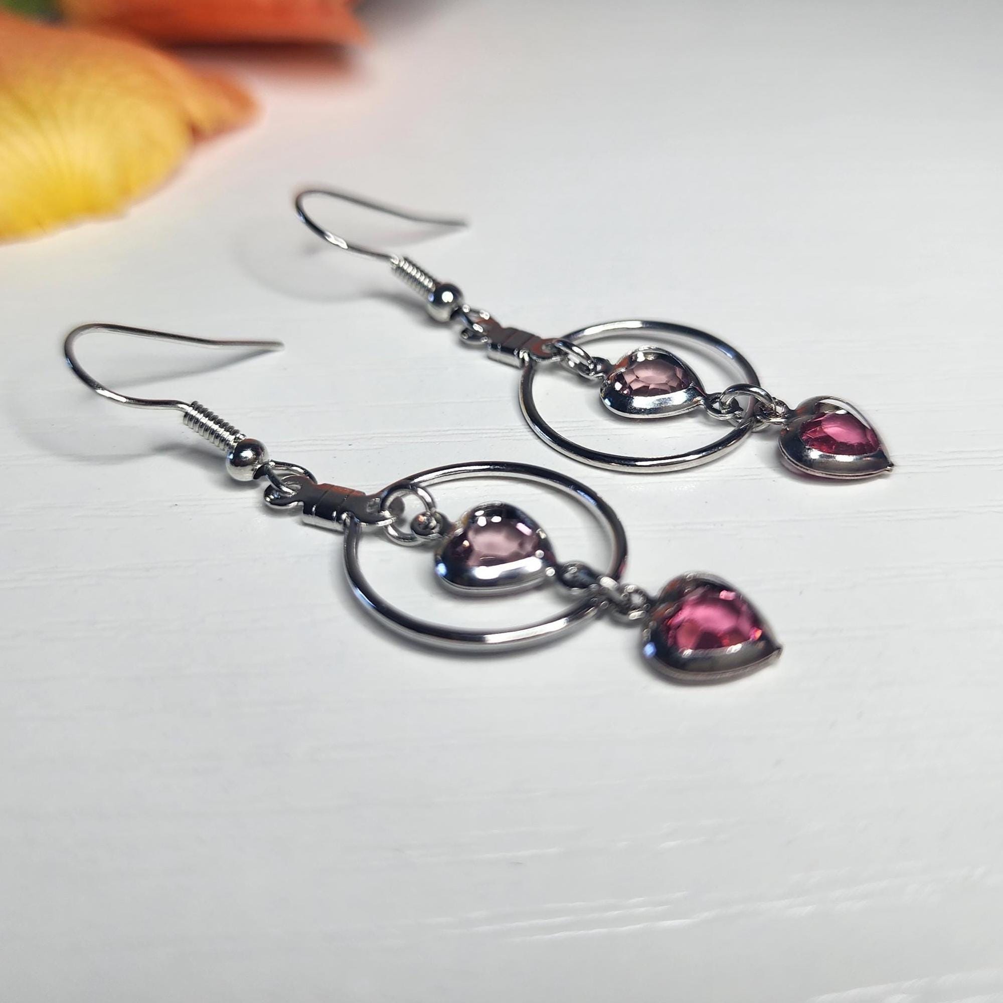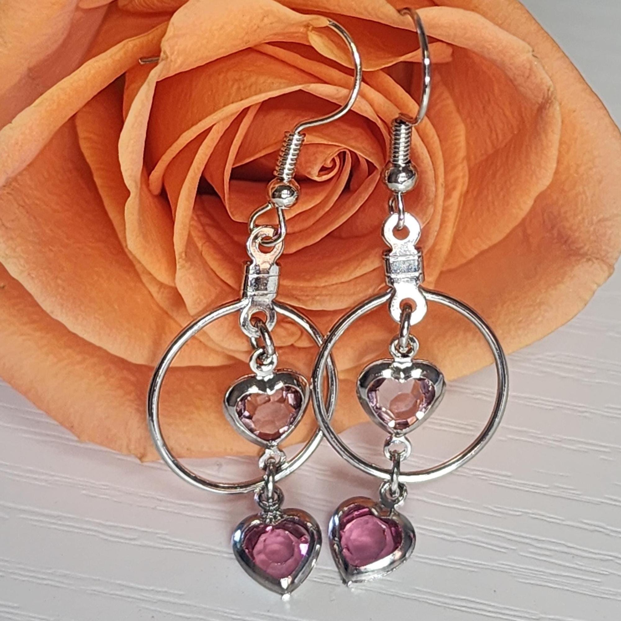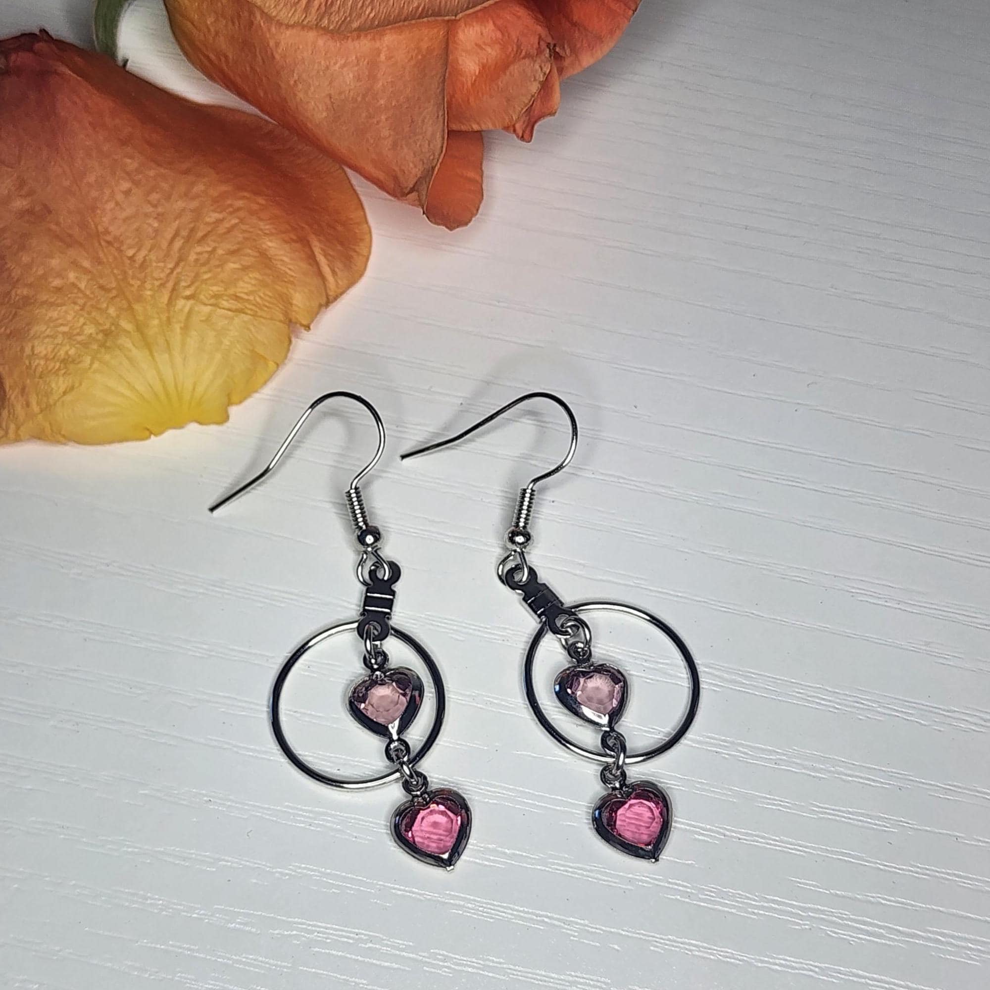 Hey there! Looking for earrings that sparkle with elegance and a pop of color? These Heart Crystal Drop Earrings are the perfect mix of modern minimalism and romantic charm. Each earring features two faceted pink heart crystals framed in polished silver-tone metal — one resting delicately inside a hoop and another dangling gracefully below it. The result? A design that moves beautifully with every turn of your head and catches the light just right.